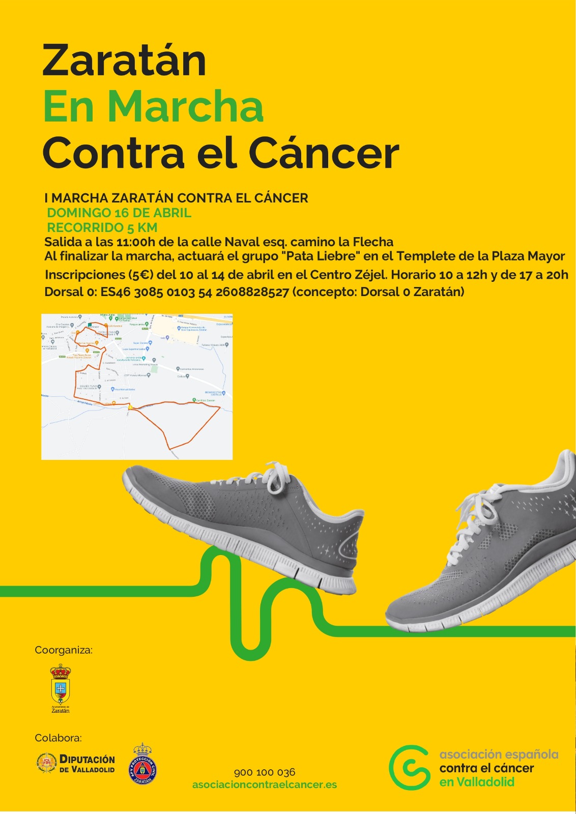 El Ayuntamiento de Zaratán tiene el placer de anunciar la celebración de la primera marcha solidaria en colaboración con la AECC de la localidad, Zaratán En Marcha Contra el Cáncer: I MARCHA ZARATÁN CONTRA EL CÁNCER, que tendrá lugar el próximo domingo 16 de abril.
