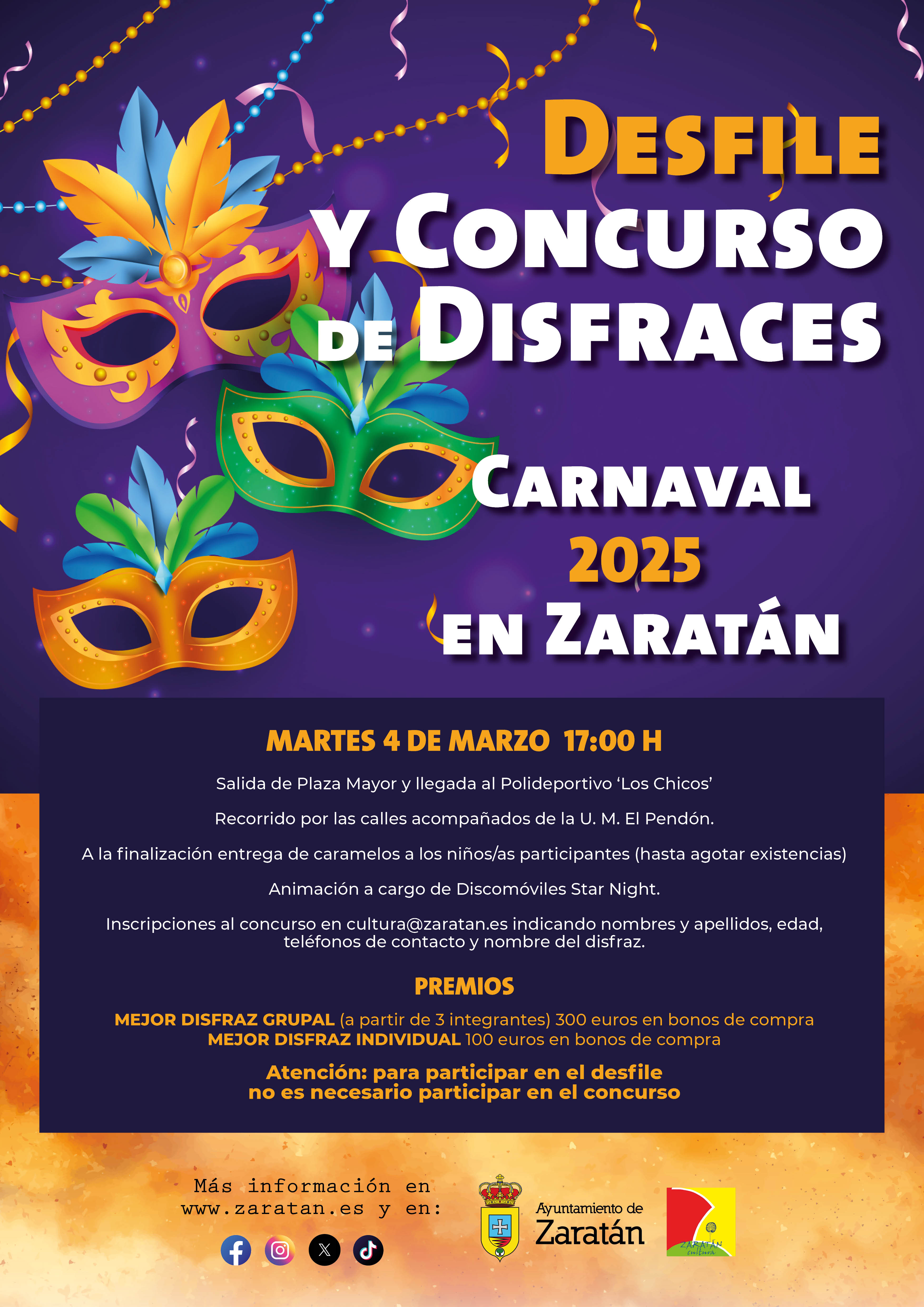 Para desfilar no es obligatorio concursar, pero están abiertas las inscripciones al Concurso de Disfraces, con premios al Mejor Disfraz Grupal e Individual. Las inscripciones al concurso pueden realizarse a través del correo cultura@zaratan.es indicando nombre y apellidos, edad, teléfonos de contacto y nombre del disfraz.