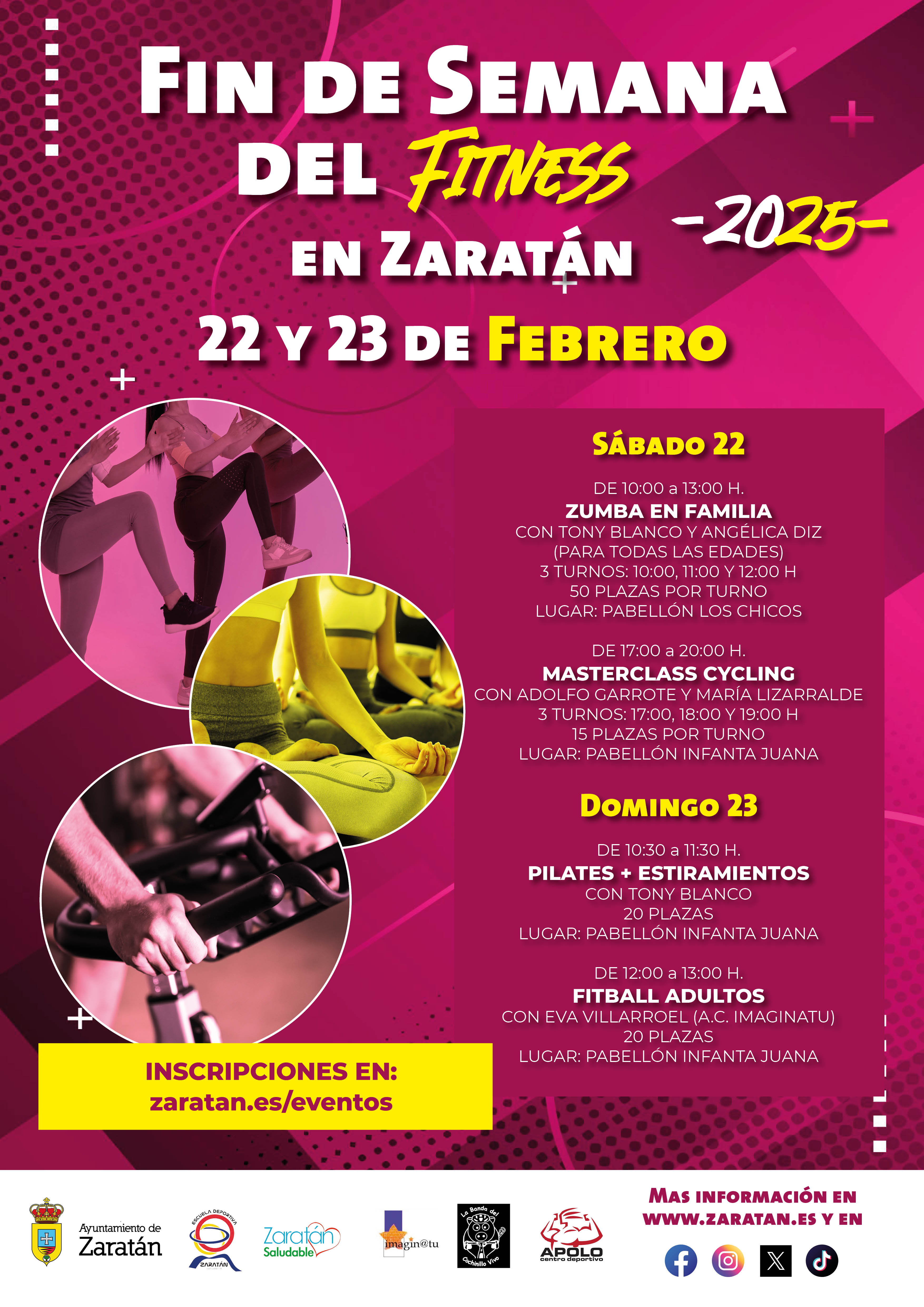 Este sábado 22 y domingo 23 de febrero el Pabellón Municipal Los Chicos y el Pabellón Infanta Juana acogerán distintas actividades gratuitas, como Zumba en Familia, varias masterclass de Cycling, Pilates y Estiramientos o Fitball para adultos.