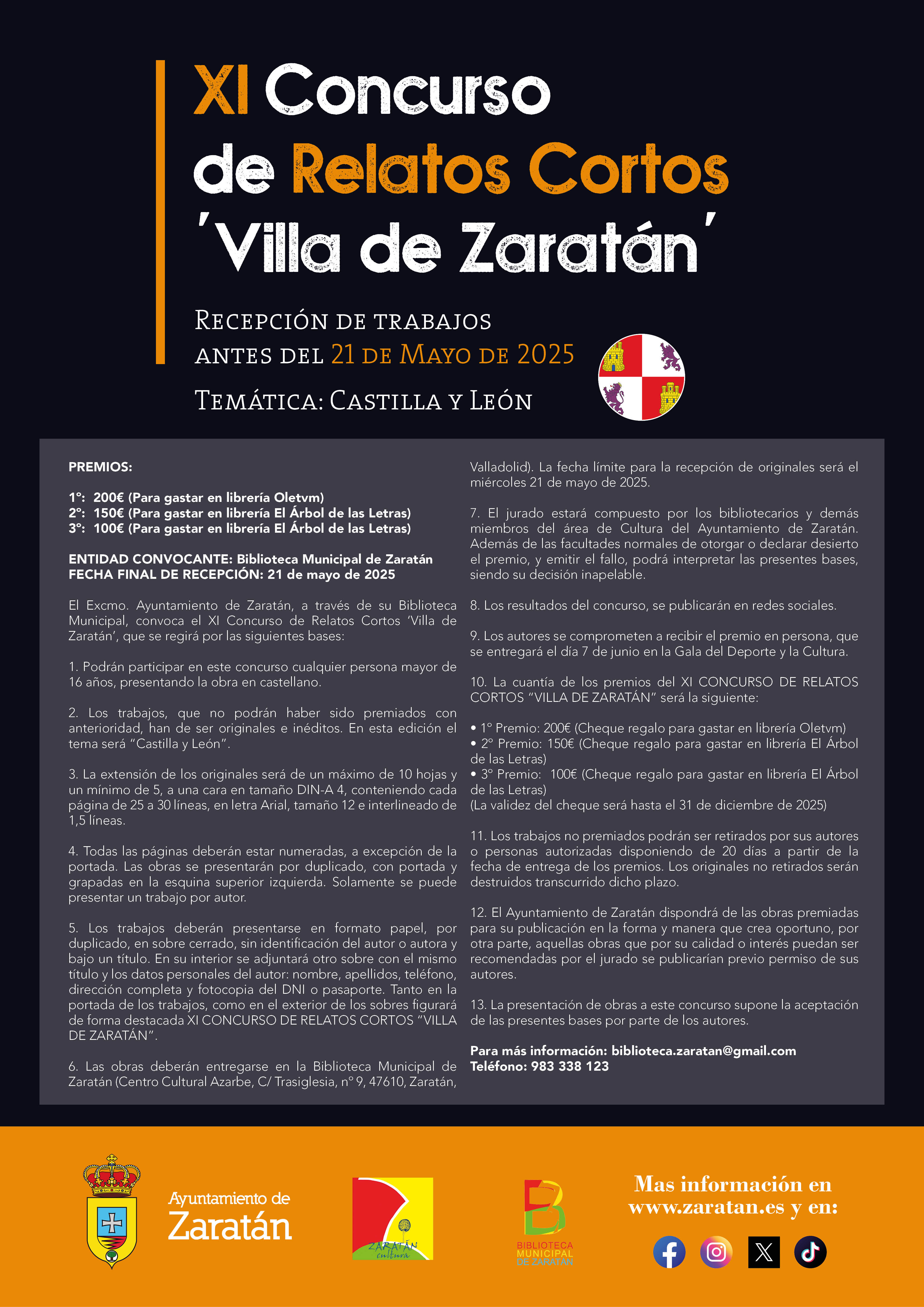 El XI Concurso de Relatos Cortos 'Villa de Zaratán' volverá a ofrecer a todos los vecinos la oportunidad de poner a prueba su ingenio y talento con las letras. Organizado por el Ayuntamiento de Zaratán, a través de la Concejalía de Cultura y de la Biblioteca Municipal de Zaratán, este concurso lleva este año la temática de Castilla y León, y ofrecerá un total de 450 euros en cheques regalo para su consumo en material de lectura. El primer premio será de 200 euros (Para gastar en la librería Oletvm); el segundo de 150 euros (Para gastar en la librería El Árbol de las letras) y el tercero de 100 euros (También para gastar en la librería El Árbol de las letras).