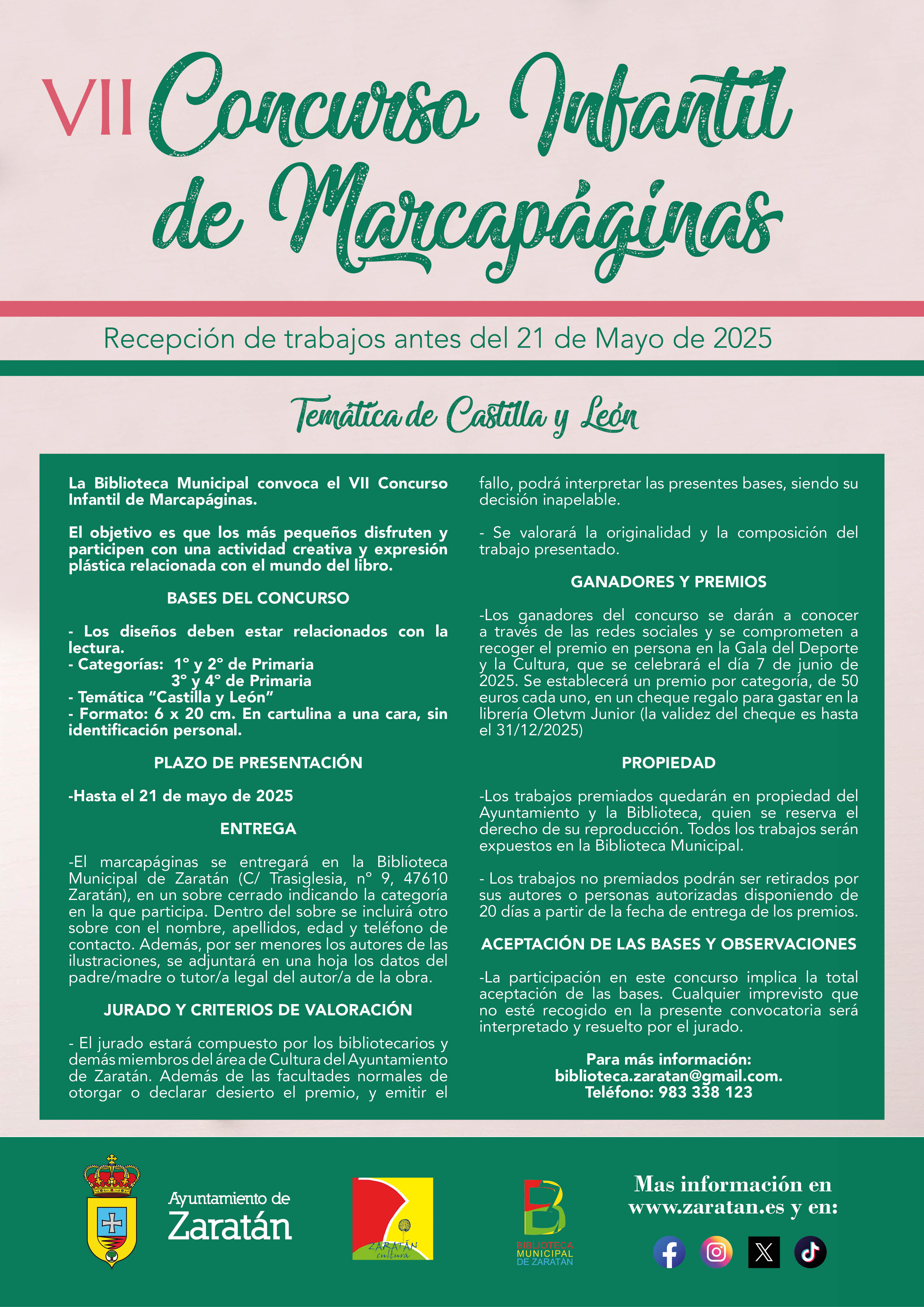 El Ayuntamiento de Zaratán, a través de la Concejalía de Cultura y de la Biblioteca Municipal de Zaratán, presenta la nueva edición del VII Concurso Infantil de Marcapáginas, que volverá a fomentar la creatividad entre los más pequeños y la afición por la lectura. Su objetivo es que los más pequeños disfruten y participen con una actividad creativa y con la expresión plástica vinculada con el mundo del libro.